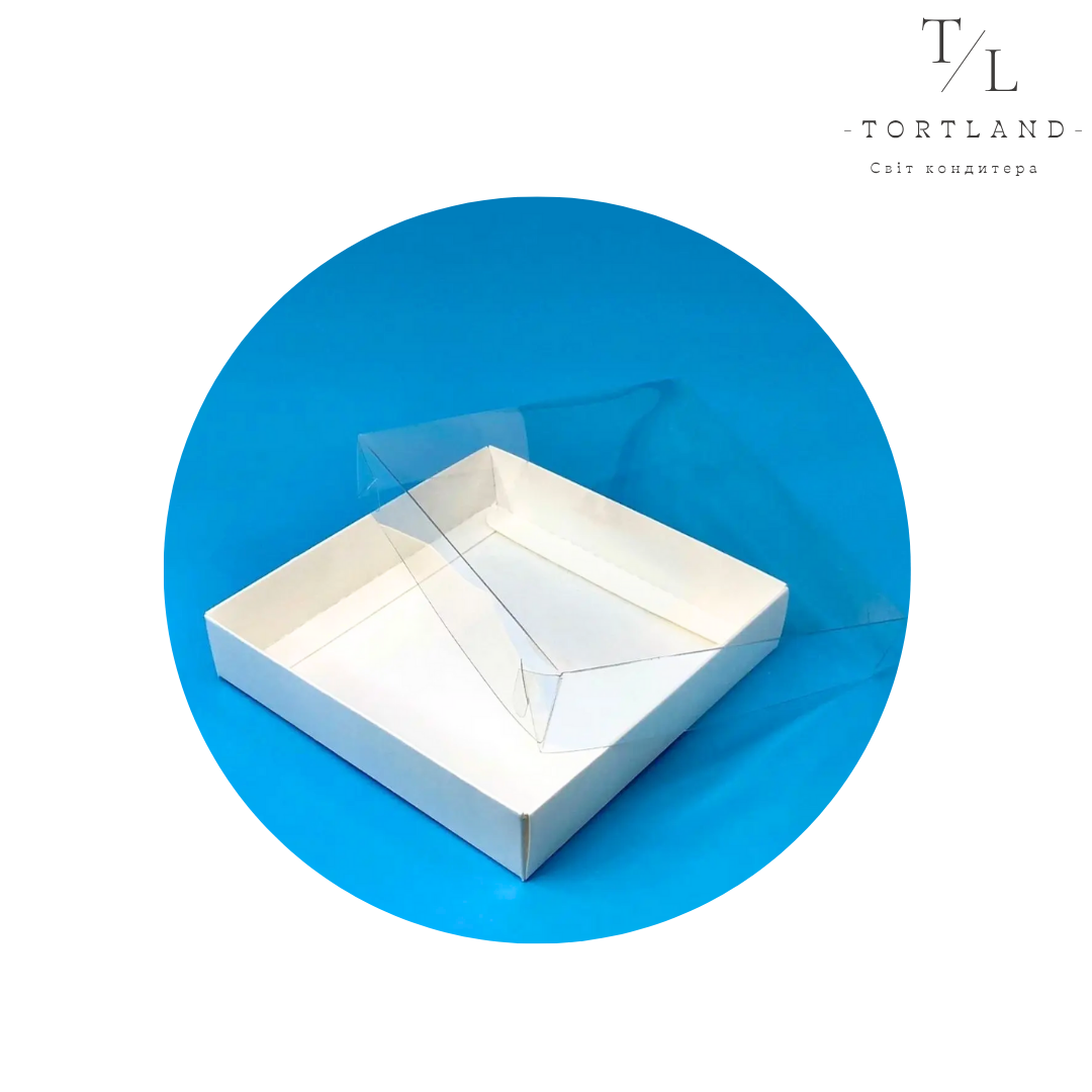 Біла коробка з прозорою кришкою для пряників 20х20х3 см