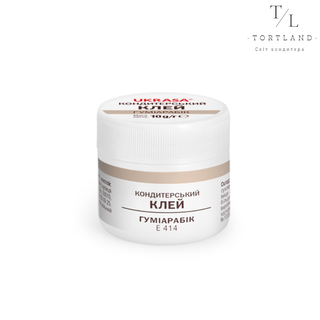 Гуміарабік – харчова добавка природного походження, яку отримують з застиглого на повітрі соку певних сортів акації. Гуміарабік в виробництві харчових продуктів відіграє роль стабілізатора, плівкоутворювача і регулятора структури, оскільки через особливості будови молекули цієї речовини гуміарабік здатний утворювати розчини з низькою в’язкістю навіть при високій молекулярній масі. Гуміарабік безбарвний, добре розчиняється у воді, утворюючи клейкий слабокислий розчин. Найчастіше гуміарабік застосовують в харчовій промисловості: для надання блиску хлібобулочним виробам; додається в основу жувальної гумки де він утримує різні аромати основному складі, роблячи післясмак гумки тривалішим; підходить для запобігання кристалізації цукру, в якості сполучного компонента у виробництві цукерок та пастили; використовується в технології дражування у виробництві драже, також гуміарабік входить в рецептуру різних алкогольних і безалкогольних напоїв та пива. ТМ «Украса» рекомендує використовувати гуміарабік в якості кондитерського клею для склеювання багатокомпонентних або пошкоджених кондитерських прикрас з білкового крему та цукрової пасти. Клей кондитерський (гуміарабік) безбарвний, має нейтральний смак і є безпечним для здоров’я.