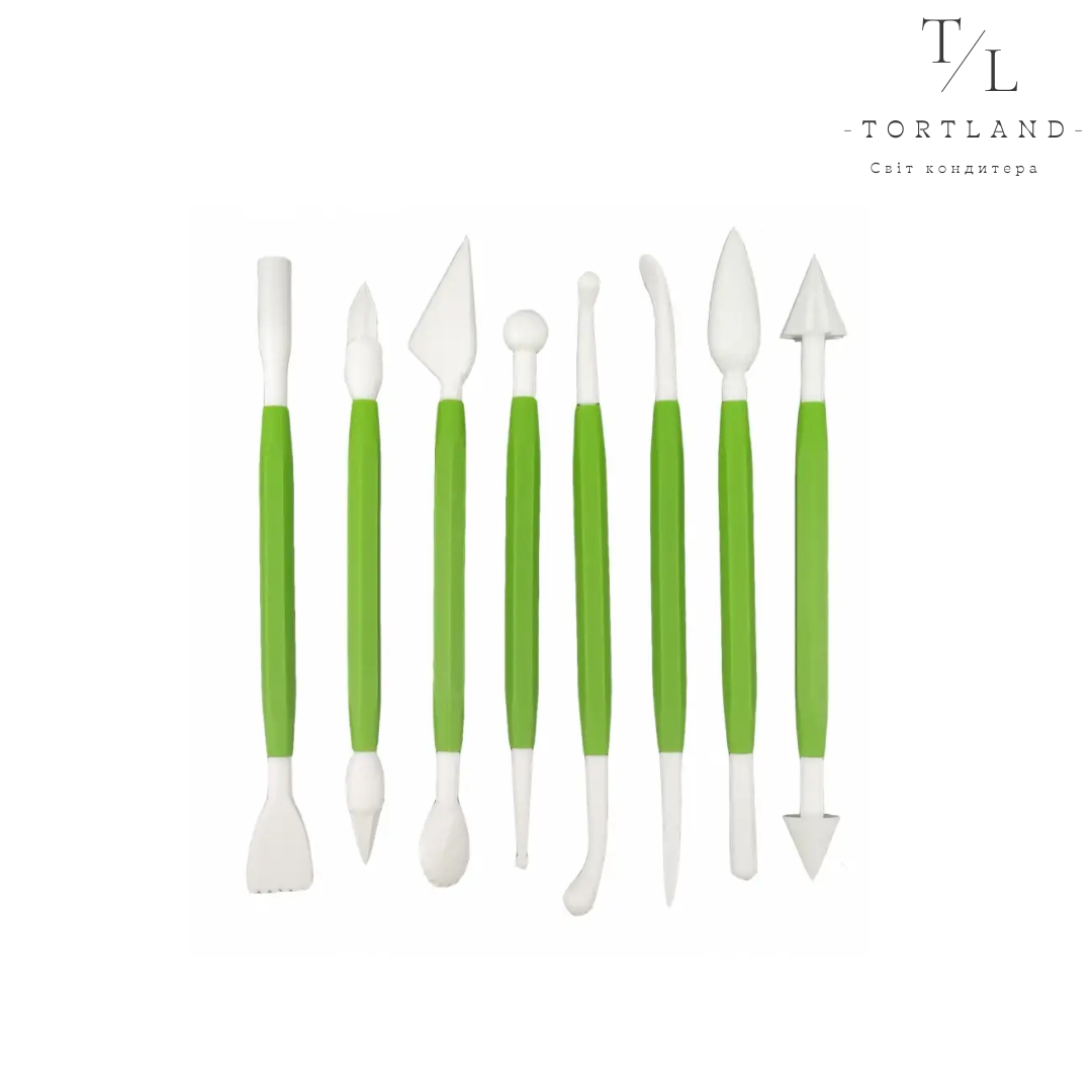 Набір інструментів для мастики з 8-ми підходить для моделювання фігурок і формування унікальних візерунків. Крім мастики підходить також для роботи з полімерною глиною. Матеріал — харчовий пластик.