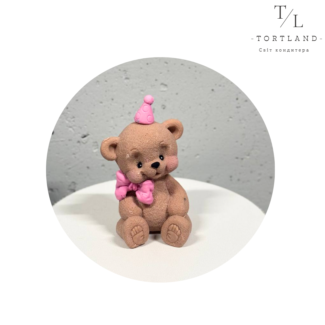 Шоколадна фігурка “Ведмедик коричневий з рожевим бантиком та ковпачком”