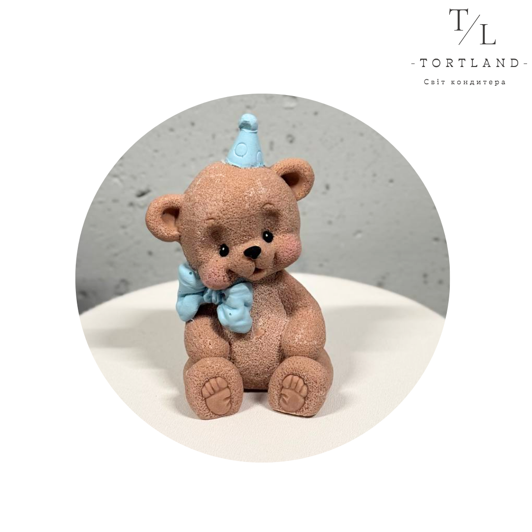 Шоколадна фігурка “Ведмедик коричневий з блакитним бантиком та ковпачком”