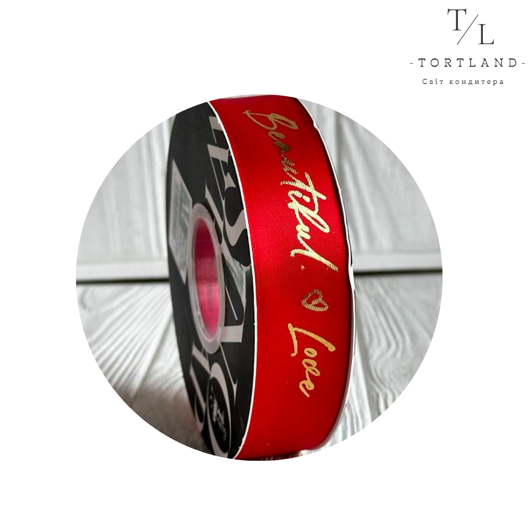 Стрічка атласна 2,5 см, “Beautiful love” червона, 30 м