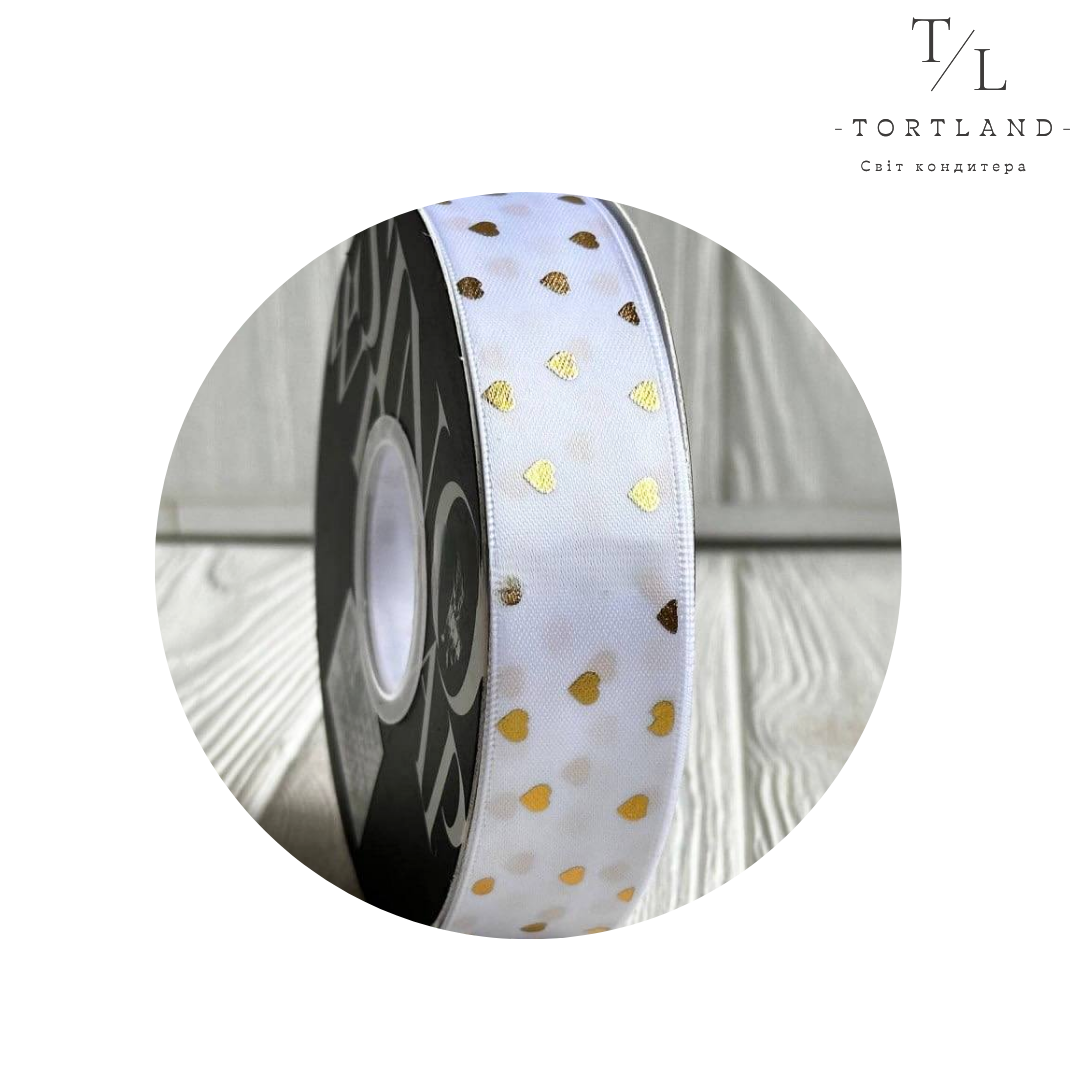 Стрічка атласна 2,5 см біла в золоте сердечко , 30 м